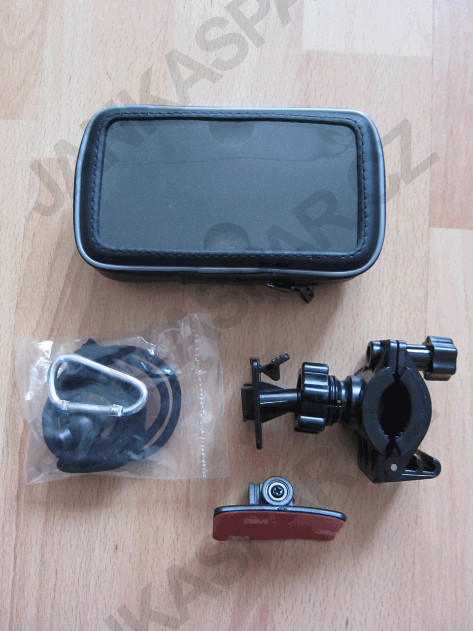 Držák se jednoduše uchytí na řidítka a díky kloubu je nastavitelný všemi směry. Pokud budete chtít místo mobilu použít navigaci, můžete tak místo standardní svislé polohy otočil a používat vodorovnou. Pokud nebudete ochranný obal umisťovat do držáku, v balení je poutko s karabinkou a ještě nalepovací držák. Osobně nechápu k čemu je, nemám pro něj využití.
